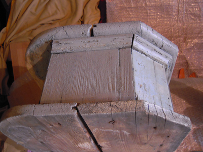 | Base après retrait des clous. Les trous d'insectes sur le drapé, après nettoyage, ont été comblés à la pâte à bois. |