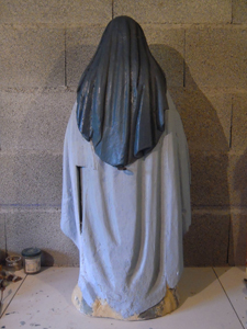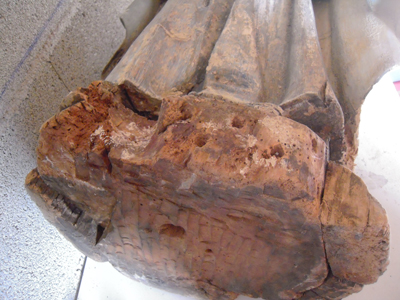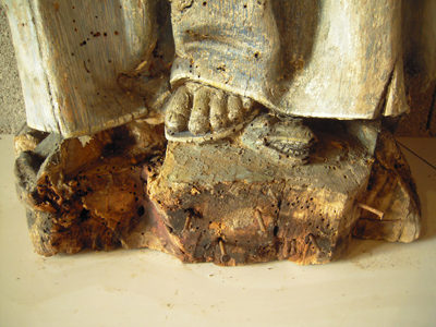| Base après retrait des clous. Les trous d'insectes sur le drapé, après nettoyage, ont été comblés à la pâte à bois. |